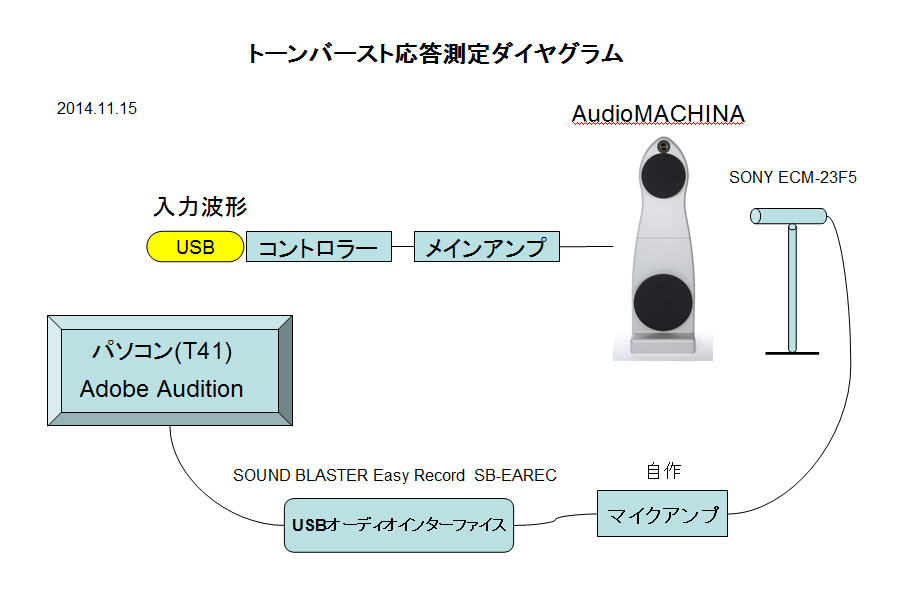 | トーンバースト 入力はは単発サイン波で 間隔を波長の10倍時間 空けてけてある 応答は波形は、 100Hzのみ2波掲載したが、 他は1波のみとした。 |