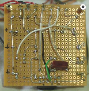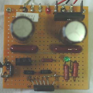 | 既成の4mm基板の作成 電源のフィルター回路も載せてしまった 6800μF(42VW)のケミコンはSONY製 ICの足を広げて穴に入れる グリーンのLEDはパイロットランプ代わり |