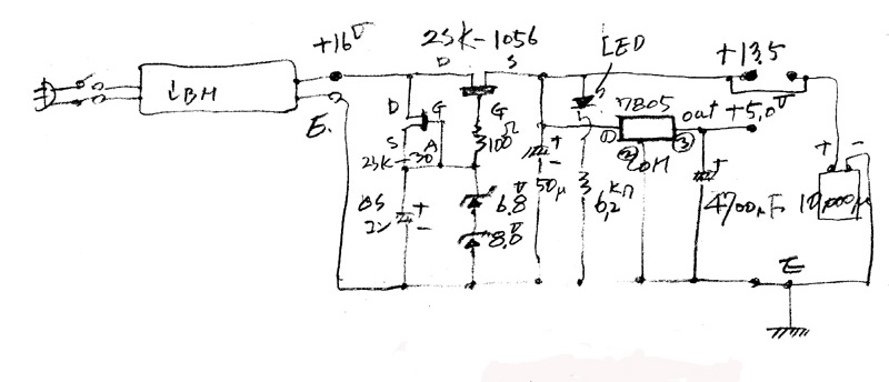 簡単に定電圧電源回路で+14Vと+5Vを供給する回路を組み立てた。下図