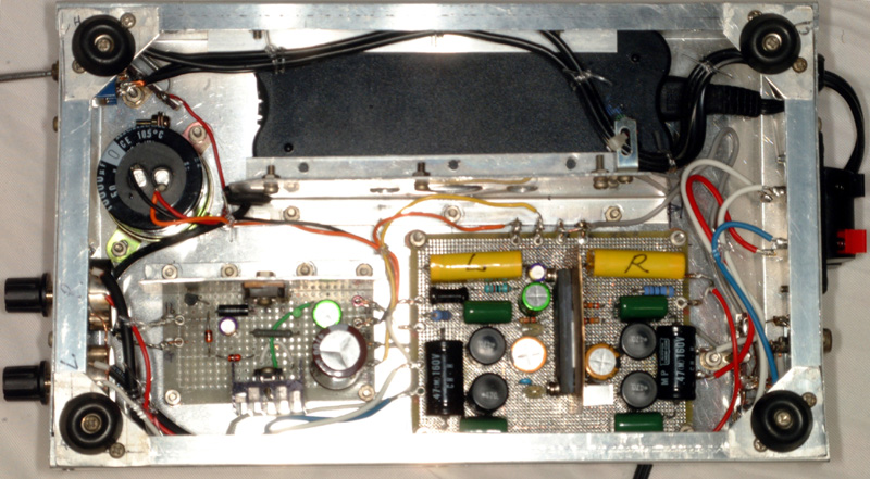 | 組み立て全景 IBM ThinkPadの電源に 定電圧電源回路を繋いで TA2020基板に供給。 シャ−シー(25×15×5cm)は あり合わせの使い済み品。 |