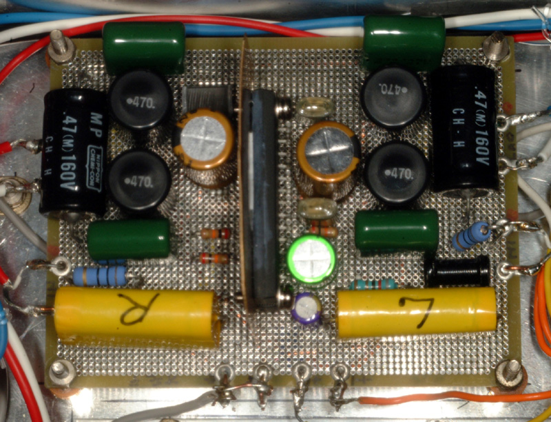| 基板の上面 市販のキットではICの片側 だけに部品を配置してあるが ピンの配置が奇数ピンと 偶数ピンが反対側配置なので それぞれのサイドに配置した。 ヒートシンクは不用らしいが、 気休めに銅板を取り付けた。 部品数が多いので苦労する。 |