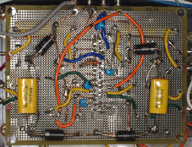 | 基板の背面 表実装だけでは配置できず裏面にも部品 を取り付けた。 1,27mmピッチの穴は、さすがに小さく、 老眼鏡に虫めがねを追加して何とかハ ンダ付けをした。 基板の穴サイズがφ0.7mmなので部品 によってはリード線が入らないので拡張。 左サイドが奇数ピン、右サイドが偶数ピ ンになる。 デジタルアース線とアナログアース線を別 々に配線し出口でまとめてシャ−シーアー スへ落とした。 |