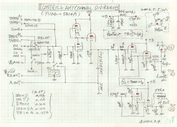 増幅付きのアクティブ系統は、メイン。増幅素子はカソドフォロワー付きSRPPで出力インピーダンスを下げてある。真空管は、足が12AX7系統で色々差し替えられるが、5814Aが最も安定している。