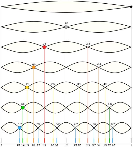 中間に節が1つ出来ると2倍音、2つ出来ると3倍音、以下4倍、5倍など下図のようになる。