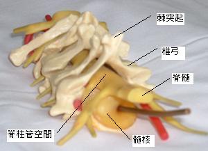 | 頸椎の構造を示す。 奥に頭部手前に胸部である。角が棘突起であり、この模型では、手前から第5番頸椎奥に4〜1番を示している。 棘突起を含む空間を形成する骨を椎弓という。頸椎は1〜7番まで7個の頸椎で構成されている。 上段に通っている楕円形が脊髄で神経の束。枝分かれしているものは神経根である。頸髄症は、この椎弓で構成される通り路(脊柱管)が狭くなり脊髄を圧迫している状態である。 |
